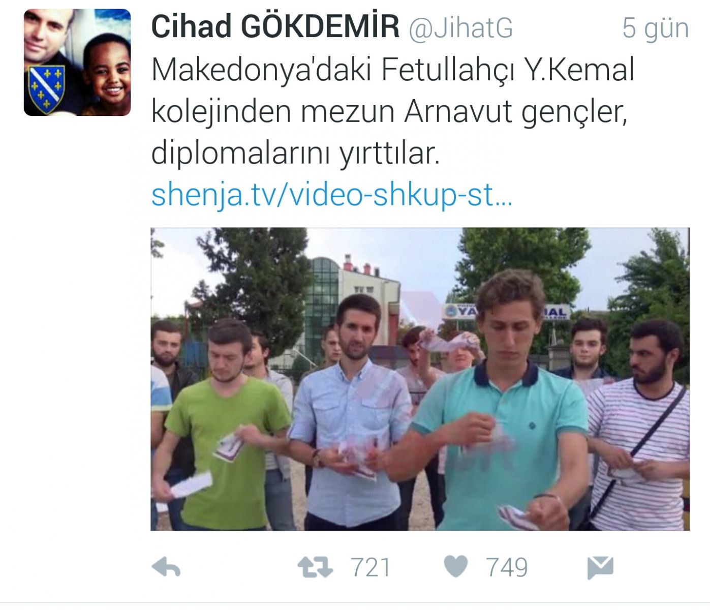 Makedonya’nın Üsküp kentinde bulunan ve Fethullahçı olduğu bilinen bir Türk kolejinden mezun olan Türk ve Arnavut Müslüman gençler aldıkları diplomaları yırtıp atarak protestoda bulundular.