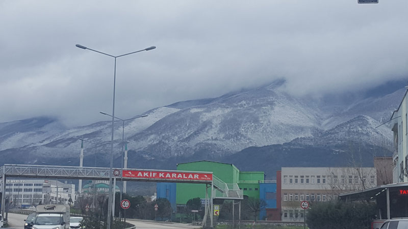 Fotoğrafı… Yakın Çevre Yolu’ndan Otosansit Kavşağı’na gelirken, kırmızı ışıkta çektik. Çünkü bu yıl ilk kez yamaçların bu kadar beyaza büründüğünü gördük.