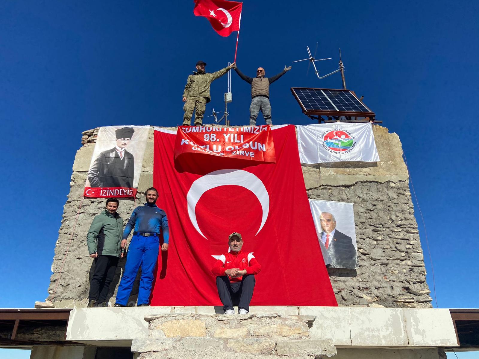29 Ekim’de arkadaşlarıyla birlikte Uludağ’ın zirvesine tırmanıyor ve bayrağımızı zirveye dikip selam duruyor.