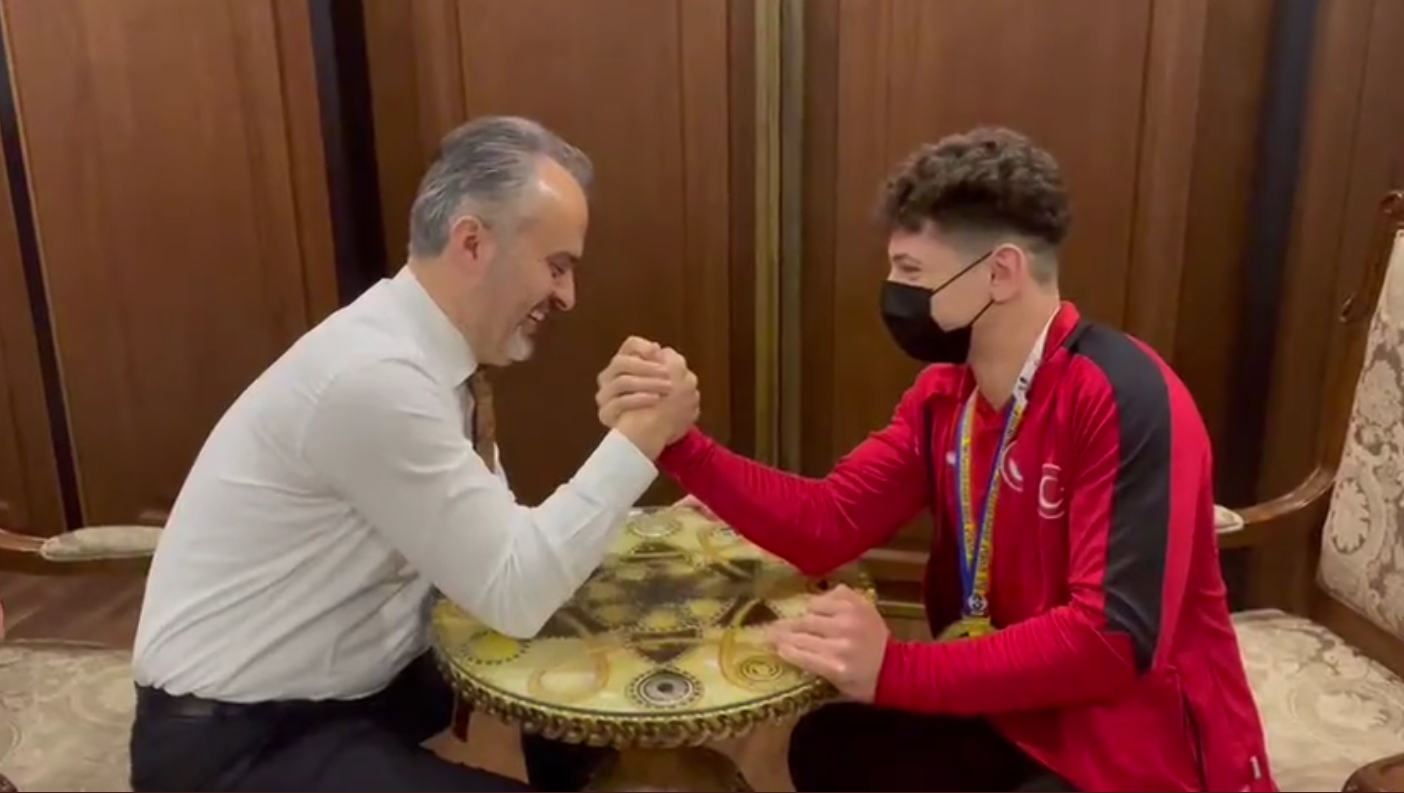 Ziyaret ettiği Büyükşehir Belediye Başkanı Alinur Aktaş’la sembolik de olsa bilek güreşi yaptı.