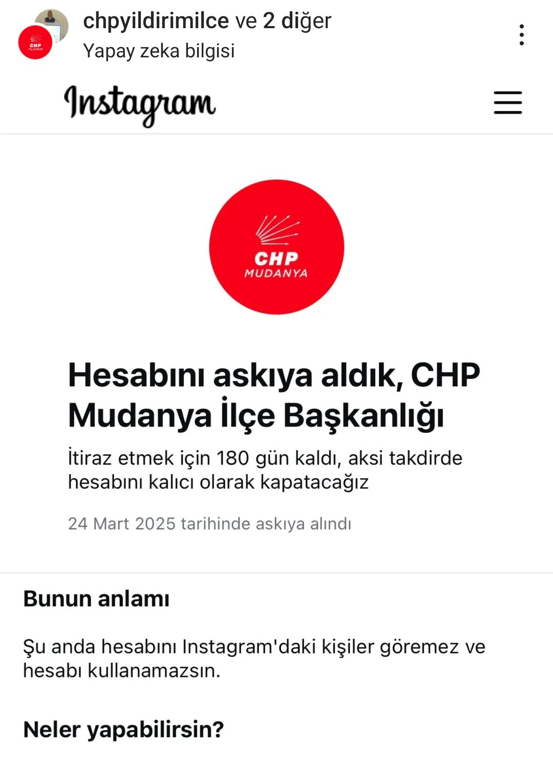 Böyle bir sorunu CHP Mudanya İlçe Başkanlığı yaşadı. Instagram’daki İlçe resmi sayfası aniden kapandı ve hesap askıya alındı.