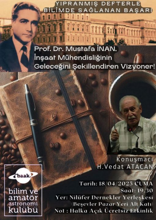 18 Mart Cuma günü saat 19.30’da Nilüfer Dernekler Yerleşkesi’nde yine çok özel söyleşiye imza atıyor. Türkiye’de inşaat mühendisliğinin geleceğini şekillendiren vizyoner olarak tanınan Prof. Dr. Mustafa İnan’ın bilimle sağlanan başarılarını Vedat Atacan dostumuz anlatacak.