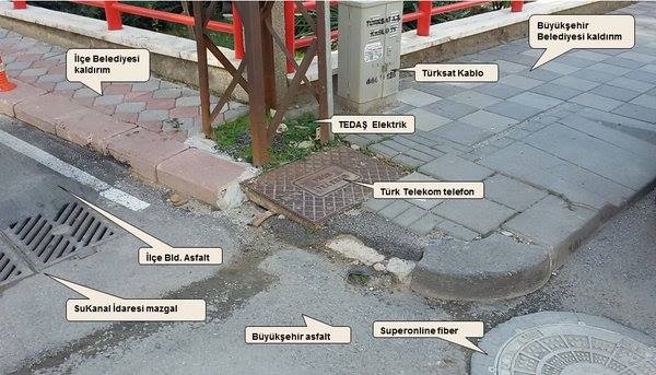 Büyükşehir’in yağmur suyu mazgalı, elektrik kurumunun direği, Telekom’un telefon kapağı, Türksat’ın kablo TV dolabı ve internet fiber kablo kuyusu kapağı da tam köşede birleşiyorlar.