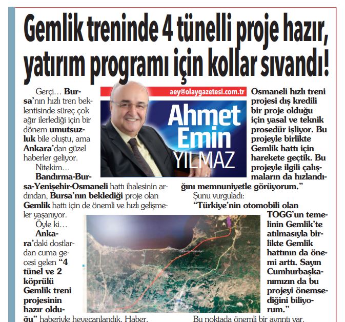 “Bursa-Gemlik Demiryolu ve Yük Merkezi’nin kesin projeleri tamamlanmıştır” deniyor. Biz bu cümleden Gemlik treninin programa girecek noktada olduğu anlamını çıkardık.