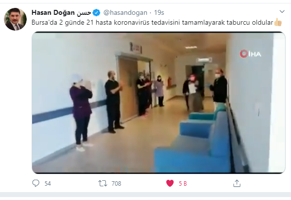 Koronavirüs tedavisi gördükten sonra Bursa’daki hastanelerden taburcu olan hastaların alkışlarla uğurlandığı İHA görüntülerini paylaşan Doğan şunu yazmıştı: