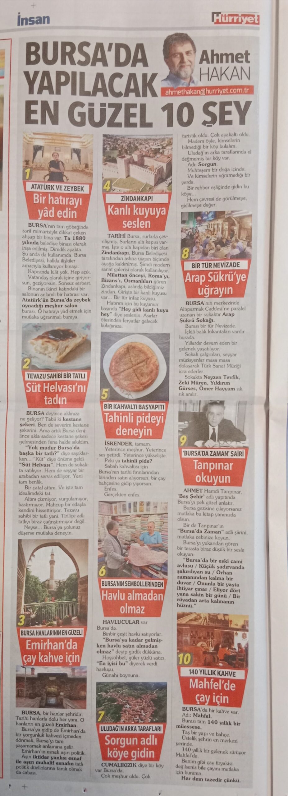 Bursa’da Yapılacak En Güzel 10 Şey başlığıyla yemeklerden köylere, Mahfel’den Arap Şükrü’ye, Emirhan’dan Sorgun’a kadar tanıtımlarla köşesinin tamamını Bursa’ya ayırdı.