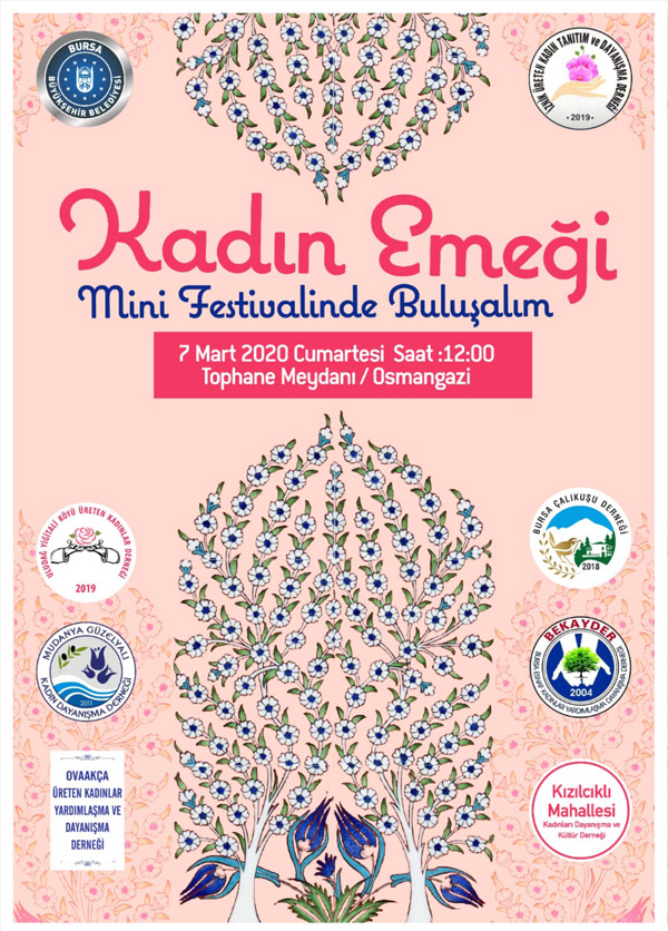 Büyükşehir Belediyesi ile İznik Üreten Kadın Tanıtım ve Dayanışma Derneği organizasyonuyla Tophane Meydanı’nda saat 12.00’de başlayacak festivalde Uludağ Yiğitali Üreten Kadınlar Derneği, Mudanya Güzelyalı Kadın Dayanışma Derneği, Ovaakça Üreten Kadınlar Yardımlaşma ve Dayanışma Derneği, Bursa Çalıkuşu Derneği, Busa Esnaf Kadınlar Yardımlaşma ve Dayanışma Derneği, Kızılcıklı Mahallesi Kadınları Dayanışma ve Kültür Derneği üyeleri emeklerini sergileyecekler.