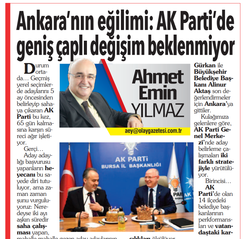 “Osmangazi’de Belediye Başkanı Mustafa Dündar’la geçen dönem milletvekili Mustafa Esgin arasında değerlendirme yapılmış ve Dündar’ın devamı eğilimi daha önce ortaya çıkmıştı. Son görüşmelerde teşkilat dışı öneriyle Cüneyt Karlık adı geldi. Bunun üzerine Ali Yılmaz’ı da katarak yapılan üçlü anketten yine Mustafa Dündar çıktı.”