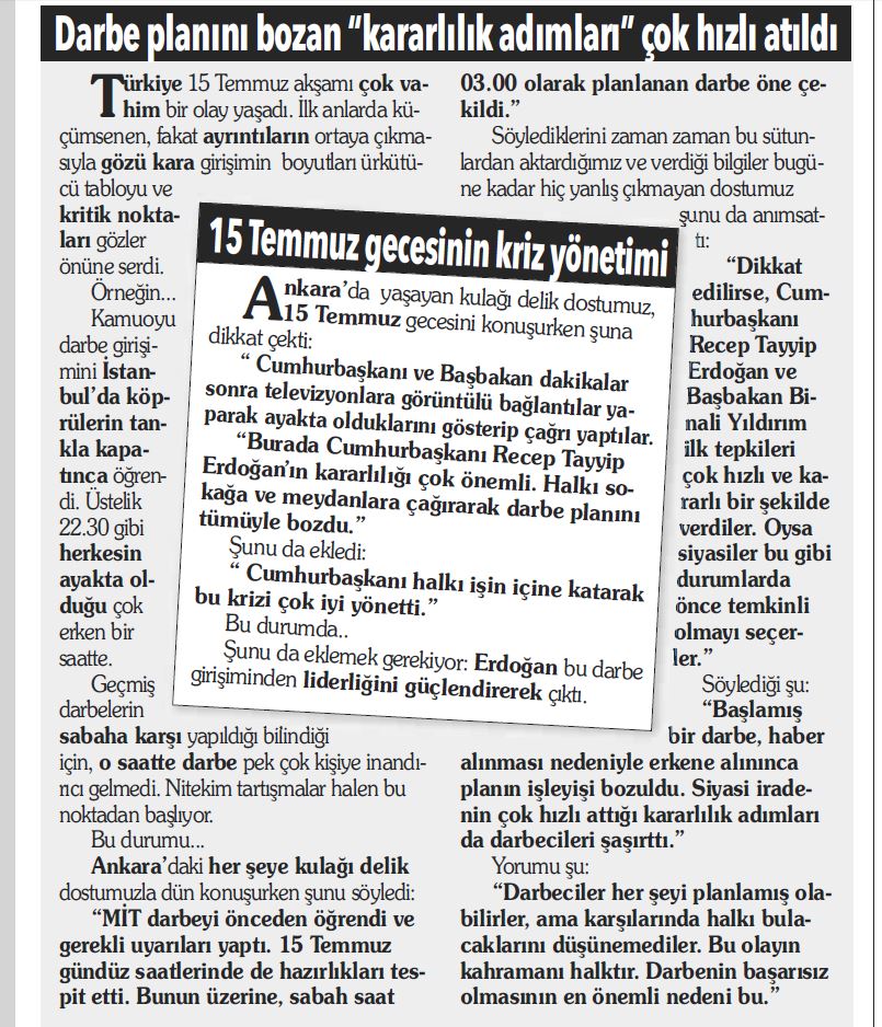 “15 Temmuz günü yaşanan ‘terör darbesi’ için yeni bir şey söylememiz gerekmiyor. Siz meseleyi 5 Temmuz tarihli Olay Gazetesi’ndeki köşenizde yazdınız zaten. O yazınıza FETÖ unsurunu ilave etmeniz yeterli.”