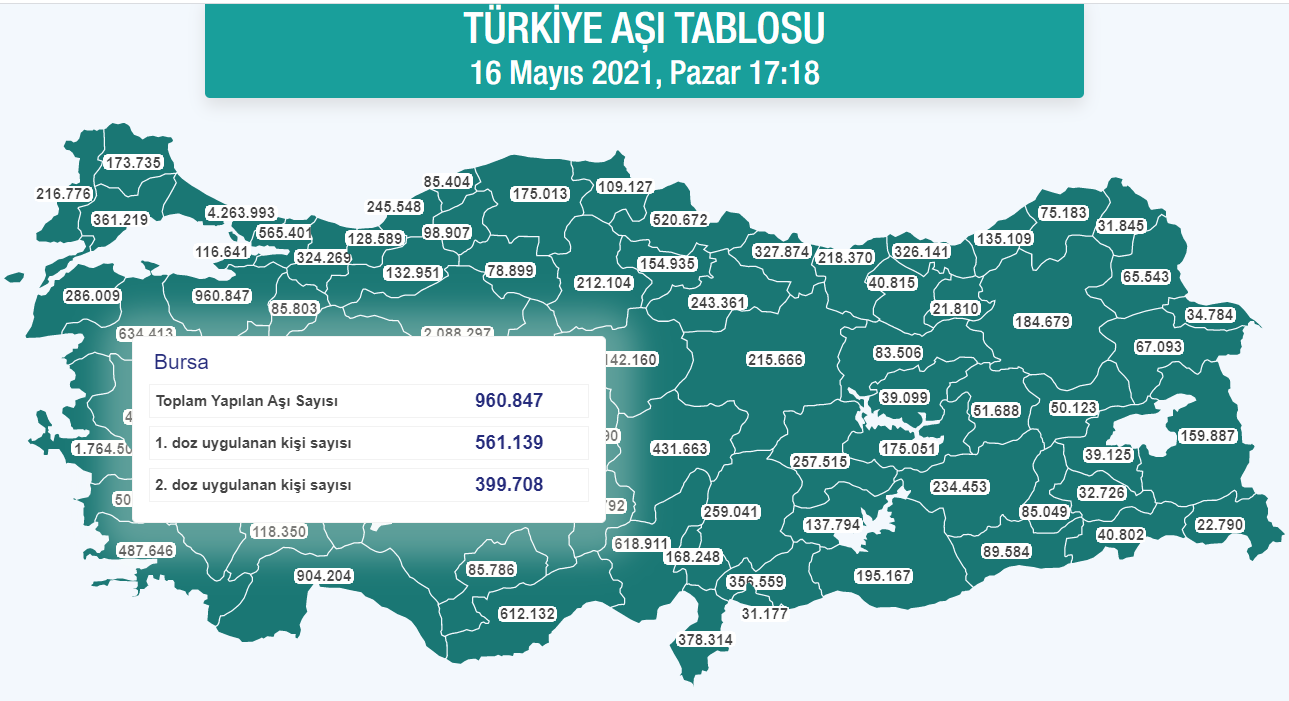 Tablo şu: Bursa’da bugüne kadar 561.139’u birinci doz ve 399 bin 708’i ikinci doz olmak üzere toplam 960 bin 840 aşı yapıldı.