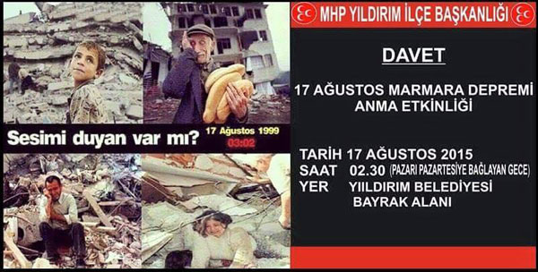 Dünyanın en fazla can kaybına yol açan depremleri arasına giren İzmit Körfezi merkezli büyük depremin yarın 16. yıldönümü. Felakette yitirdiğimiz canları anmak ve geleceğe yönelik uyarıcı olmak adına MHP Yıldırım İlçe tarafından etkinlik düzenlendi.