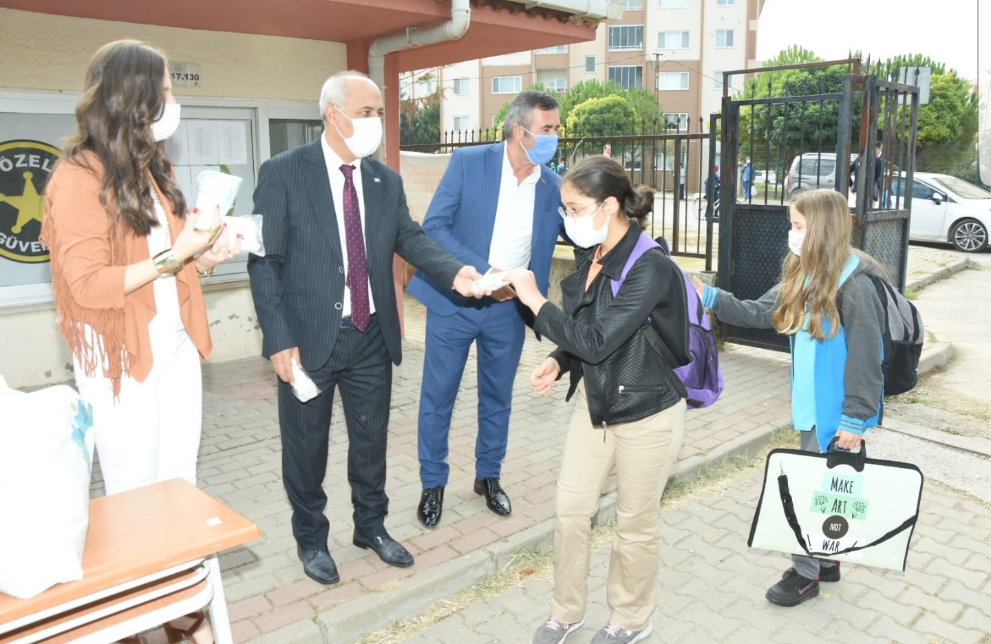 Pandemi süreci başladığında maske üreten ilk belediyelerden biri Yenişehir Belediyesi’ydi. Başkan Davut Aydın bu kez de, ilçedeki okulların kapılarına gidip öğrencilere maske ve kolonya dağıttı.