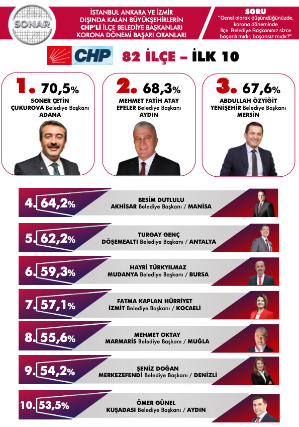 Yüzde 70.5’lik memnuniyet oranıyla Adana Çukurova Belediye Başkanı Soner Çetin ilk sırayı alırken, yüzde 68.3’le Aydın Efeler Belediye Başkanı Mehmet Fatih Atay ikinci, yüzde 67.6 ile de Mersin Yenişehir Belediye Başkanı Abdullah Özyiğit üçüncü sırada bulunuyor.