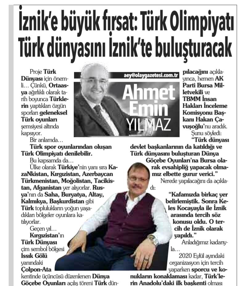 Gelişmeyi… 1 Aralık 2019 günü bu sütunlarda “İznik’e büyük fırsat: Türk Olimpiyatı Türk dünyasını İznik’te buluşturacak başlığıyla duyurduk.