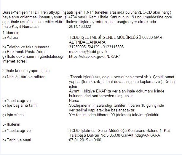 İşin süresinin yer tesliminden itibaren 90 gün olduğu vurgulanan ilanda, ihalenin 07 Ocak 2015 Çarşamba günü saat 10.00’da Ankara’da TCDD Genel Müdürlüğü Konferans Salonu’nda yapılacağı bilgisi de yer alıyor.