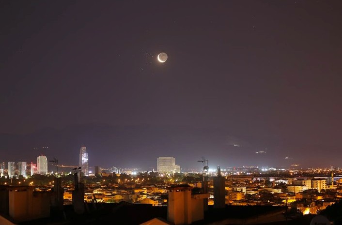 Gökyüzünde ayın hilale dönmüş görüntüsüyle, Ülker yıldız kümesinin Bursa’nın üzerinde bir arada parladıkları Tunç Tezel Ustanın fotoğrafı gökyüzünün gece sırlarını da aydınlatıyor.