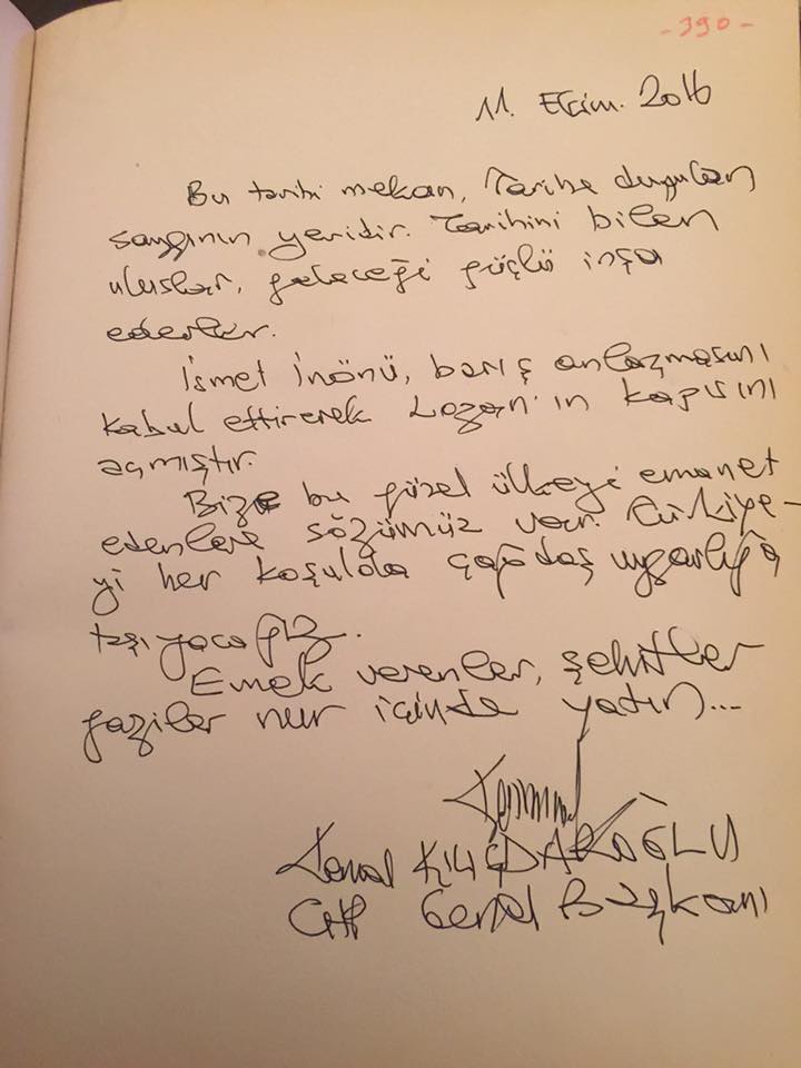 Defterin 290. sayfasındaki Kılıçdaroğlu mesajında Lozan vardı: