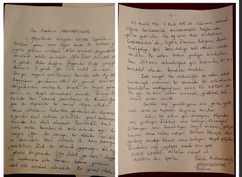 Faruk Hoca’yı arayıp ne yazdığını sorduk. Mektubu bitirdikten sonra cep telefonuyla fotoğrafını çekmiş. Bize de gönderdi.