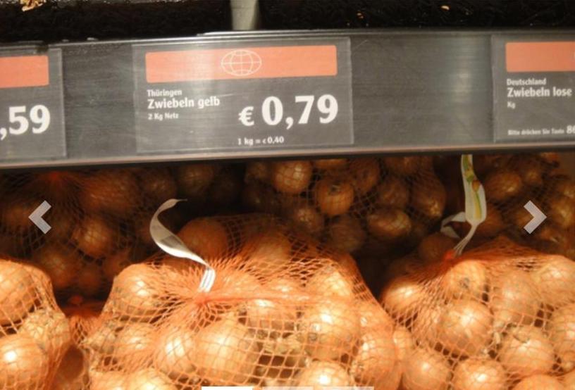 Soğan etiketinde 2 kilosu 0.79 Euro fiyat yazıyor. 79 Cent’lik etiketin Türk Lirası karşılığı ise 8 lira oluyor. Oysa, bizdeki pazarlarda ve marketlerde soğanın kilosu fiyatları 16-20 lira arasında değişiyor.
