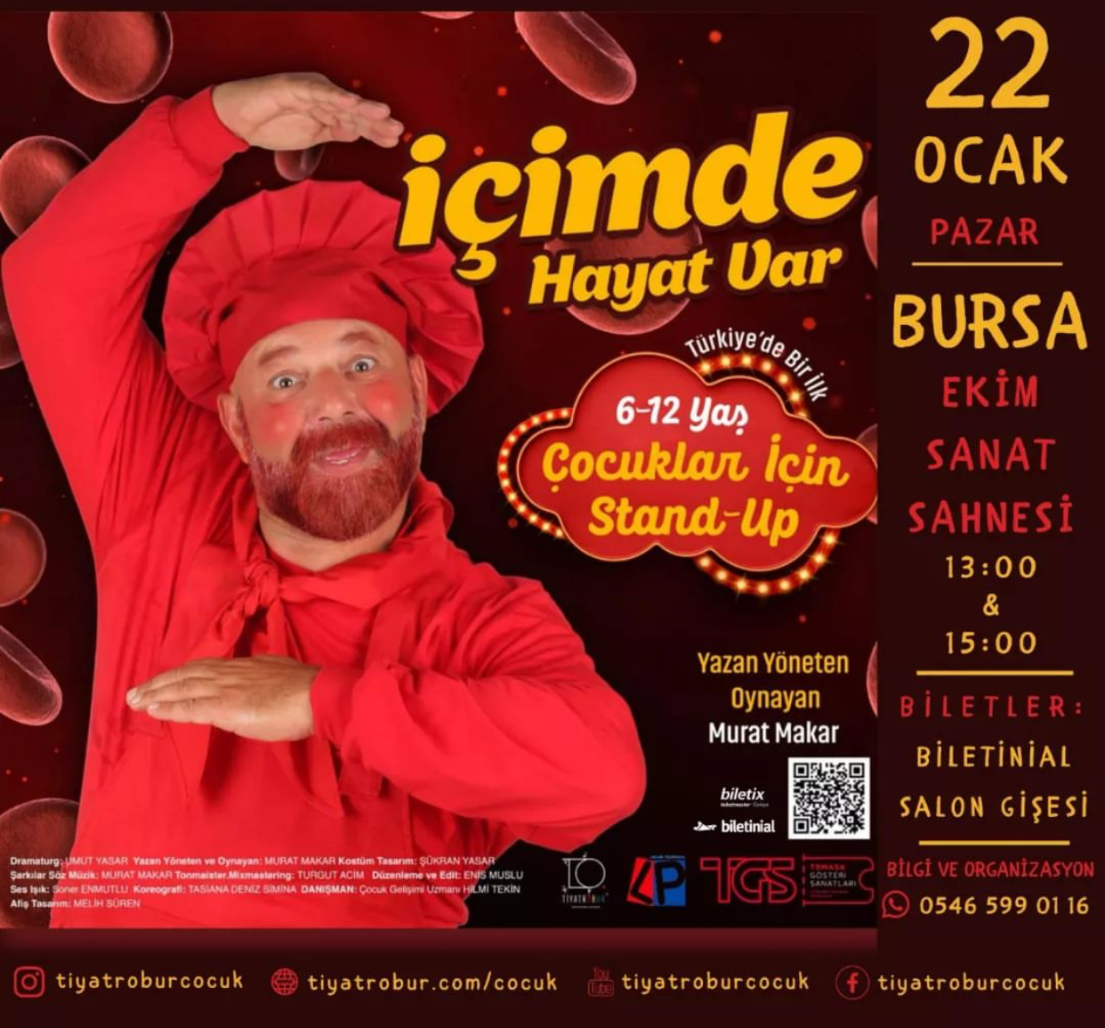 22 Ocak’ta da, al bayrağımıza al rengini veren kanımızdaki alyuvarın gözünden hayatı anlattığı İçimde Hayat Var oyunuyla Nilüfer’deki Ekin sahnesinde olacak.