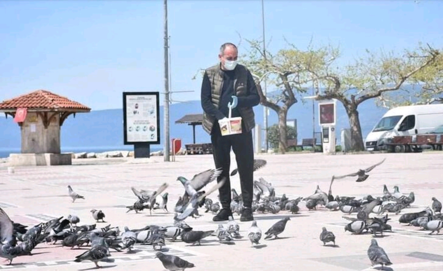 Pazar günü sahilde incelemeler yaparken, insanlar eve çekilince aç kalan güvercinleri gördü ve aracından aldığı yemleri attı.