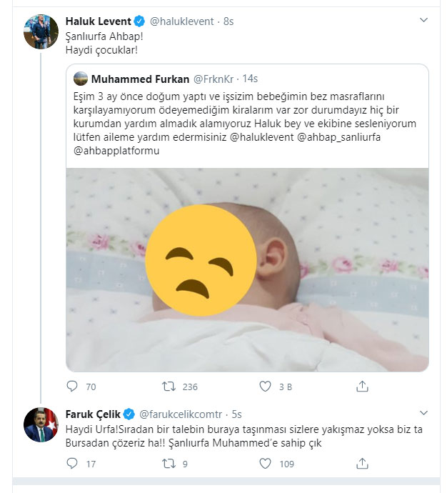 Bu mesajı Haluk Levent kendi sosyal medyasından paylaşınca; 2 dönem AK Parti Şanlıurfa Milletvekilliği yapan, ama Bursa’nın siyasetçisi olan Faruk Çelik alıp “Haydi Urfa! Sıradan bir talebin buraya taşınması sizlere yakışmaz. Yoksa biz ta Bursa’dan çözeriz ha” diye seslenmiş.