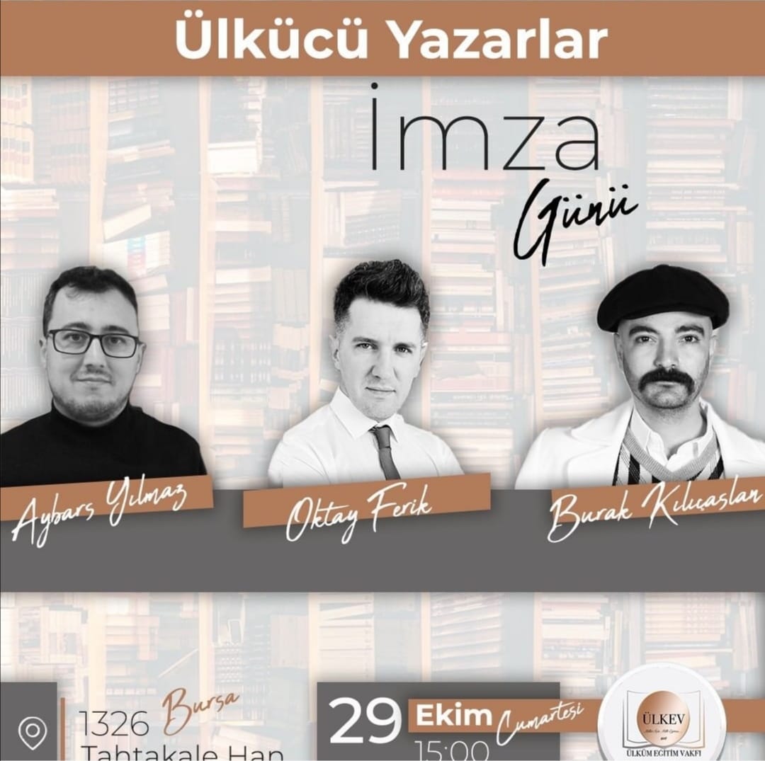 Cumhuriyet Bayramı’nın kutlandığı 29 Ekim Cumartesi günü Ülküm Eğitim Vakfı’nın Tahtakale Han içindeki merkezinde saat 15.00’te Ülkücü yazarlar olarak Aybars Yılmaz, Oktay Ferik, Burak Kılıçaslan kitaplarını imzalayacaklar.