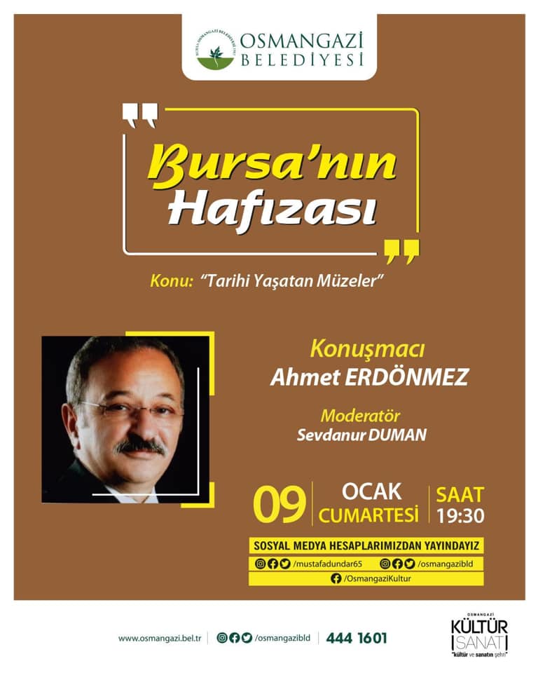 Pandemi günlerinde kent kültürü kurgulu online programda ilk etkinlik çarşamba günü Ördekli Kültür Merkezi’ndeki Bursa Yöresi Halk Dansları Kıyafetleri canlı yayını oldu. Cumartesi akşamı Bursa’nın Hafızası programının konuğu Ahmet Erdönmez’di.