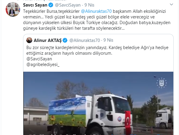 Cuma günü… Bursa Büyükşehir Belediye Başkanı Alinur Aktaş yaptığı açıklamada “kardeş belediye Ağrı’ya araç hediye edildiğini” duyurdu.