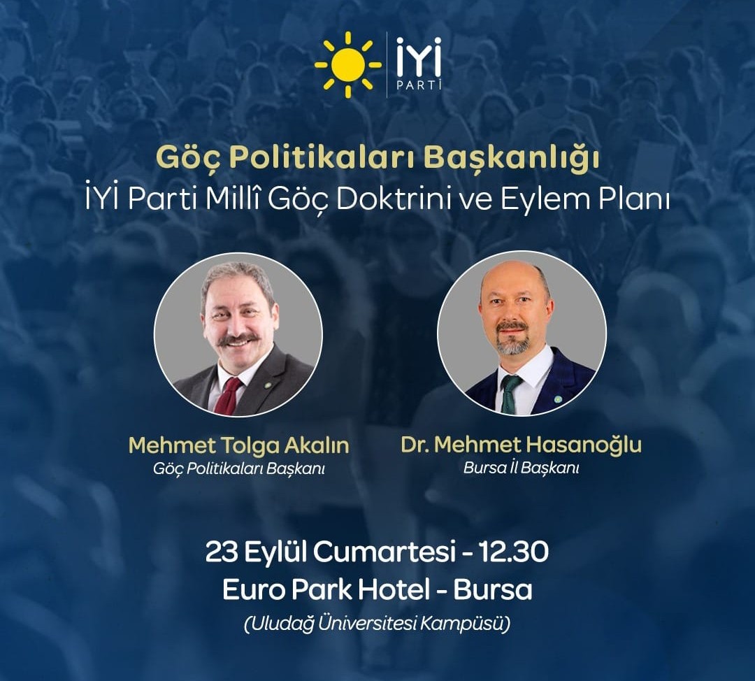 Böyle bir ortamda İYİ Parti farklı organizasyonla Bursa’ya geliyor. İYİ Parti Genel Merkezi Göç Politikaları Başkanlığı’nın organizasyonuyla 23 Eylül Cumartesi günü, BUÜ Kampüsü içindeki Euro Park Otel’de toplantı var.