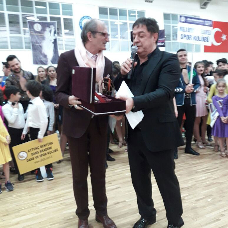 Türkiye Dans Sporları Federasyonu Başkanı ve gençlik yıllarında rakibi olan Tolga Han, dansa hizmetleri nedeniyle Macit Tnalı’ya plaket verdi.