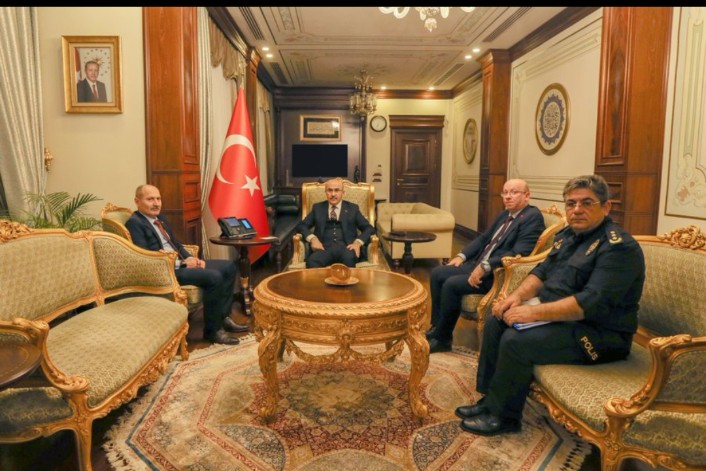 Vali Mahmut Demirtaş… Yatırım ve çalışmalarla çok ilgili. Panayır Deresi ıslah çalışmalarını inceledikten sonra Valilik binasında İl Emniyet Müdürü Dr. Sabit Akın Zaimoğlu, Emniyet Genel Müdürlüğü İnşaat Emlak Daire Başkanı İlker Saraçoğlu ve İl Emniyet Müdür Yardımcısı Sadık Demir’le toplantıya katıldı.