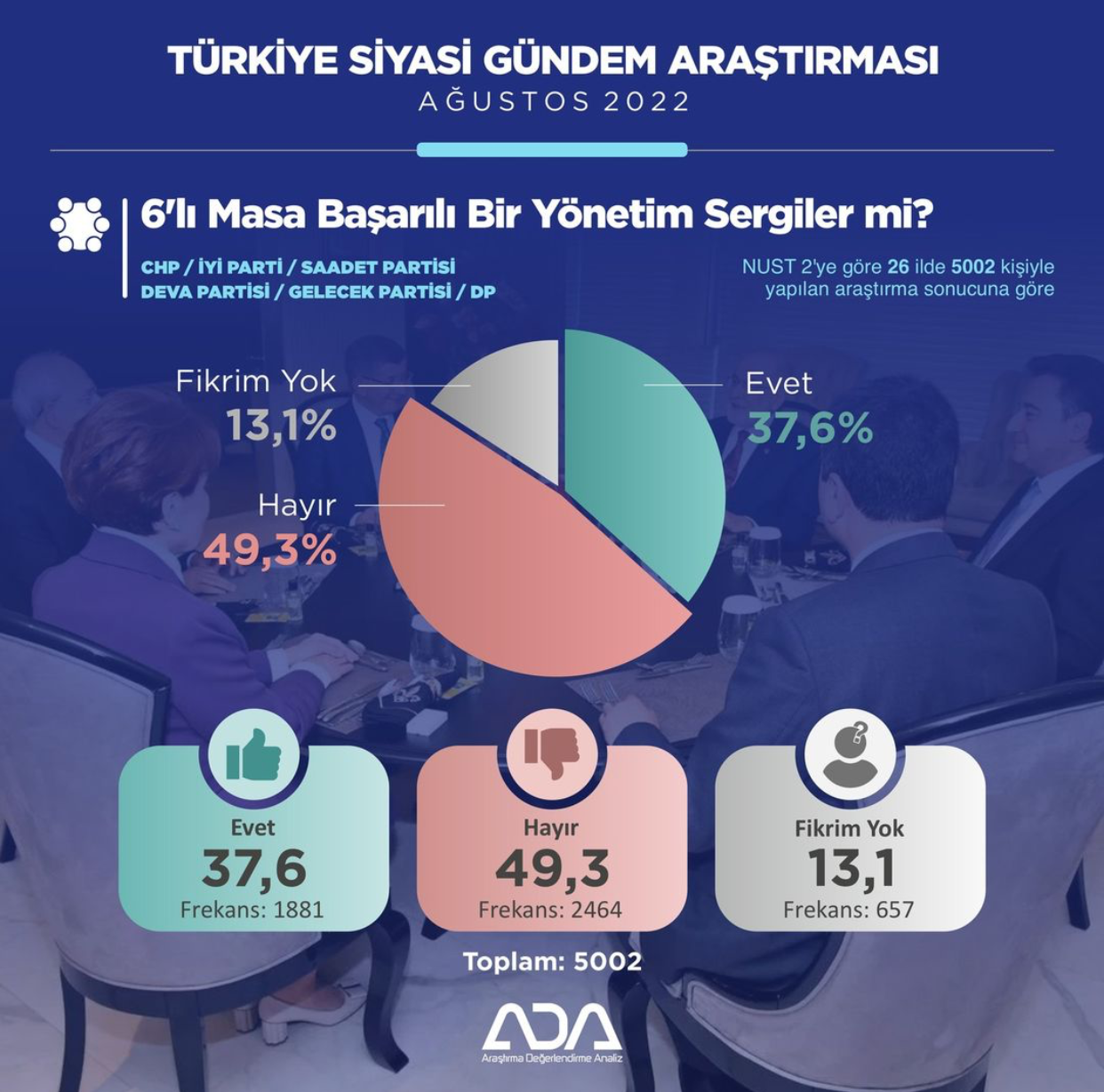Ankete katılanları yüzde 37.6’sı 6’lı Masa’nın başarılı olacağına inandığını söylerken, yüzde 49.3 inanmadığı cevabını vermiş. Fikri olmayanların oranı ise yüzde 13.1 yansımış.