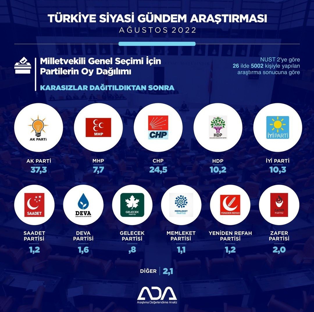 En yeni araştırmayı… ADA Araştırma Genel Müdürü Ayhan Adıgüzel dostumuz gönderdi. En doğru seçim tahminleri ve gündem araştırmalarıyla bildiğimiz ADA’nın çalışması bugünün fotoğrafını ortaya koymuş.