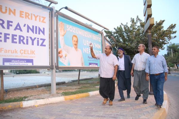 AK Parti MKYK Üyesi ve Çalışma ve Sosyal Güvenlik eski Bakanı Faruk Çelik’in biri ceketli, diğeri gömlekli el sallayan iki fotoğrafının yer aldığı afişlere Urfalılar da duyarsız değil.
