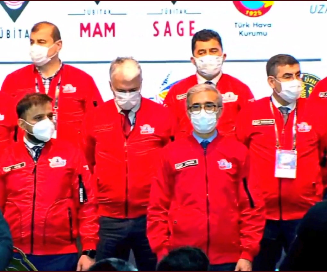 Organizasyonu üstlenen T3 Vakfı Başkanı Selçuk Bayraktar yaparken, hemen arkasında takım halinde kırmızı montuyla Bursa Teknik Üniversitesi Rektörü Prof. Dr. Arif Karademir yer alıyordu.