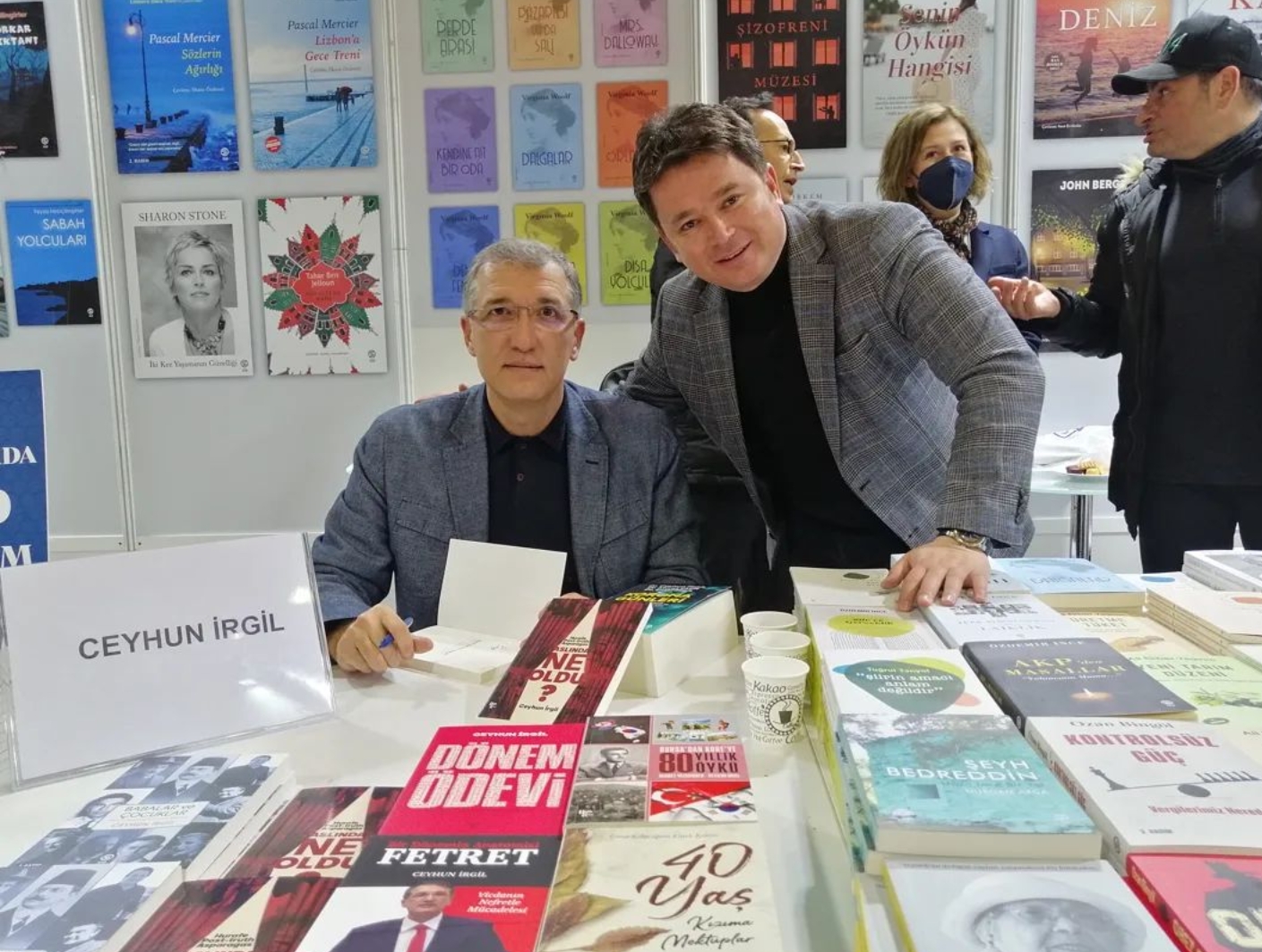 Bursa Kitap Fuarı’nda kitaplarını imzalarken, CHP Bursa Milletvekili Erkan Aydın yanındaydı.