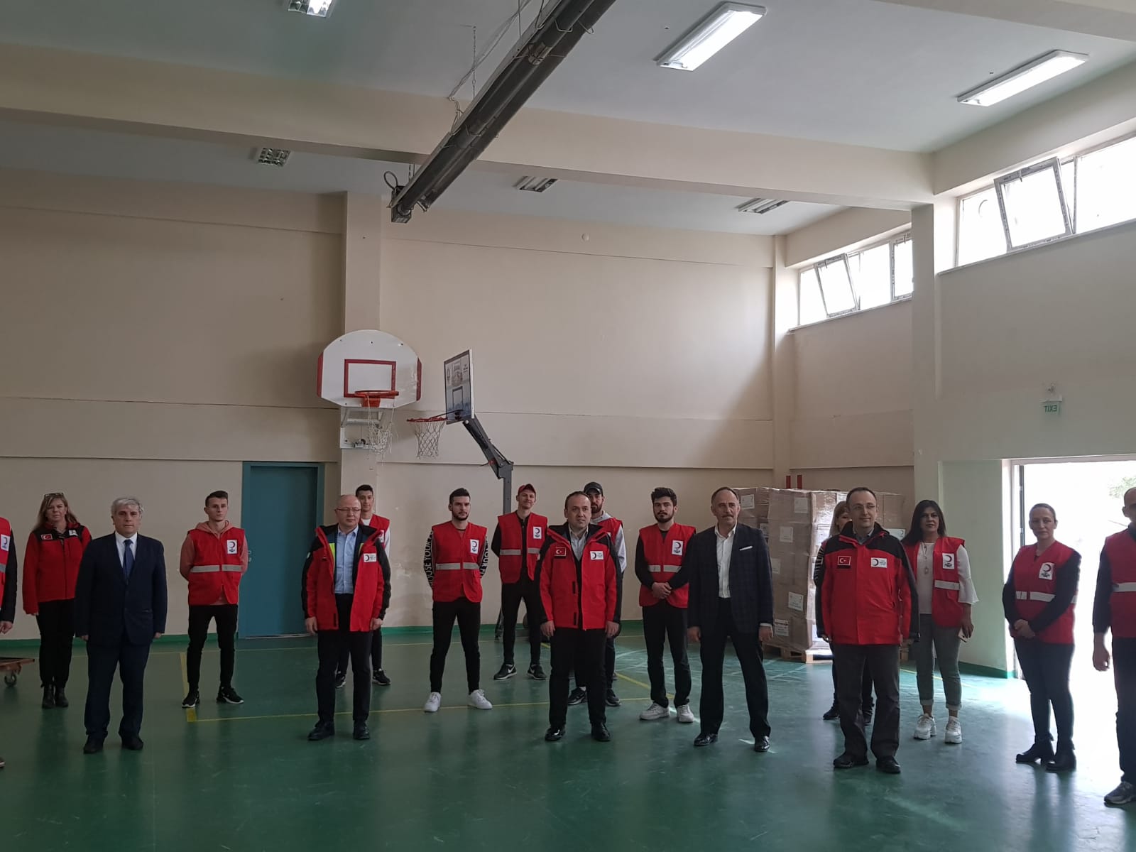 Hafta sonu Kestel, Gürsu, Yenişehir gibi ilçelerden sonra Mudanya için hazırlanan koliler Kaymakam Sözer’e spor salonunda basketbol potaları önünde teslim etti.