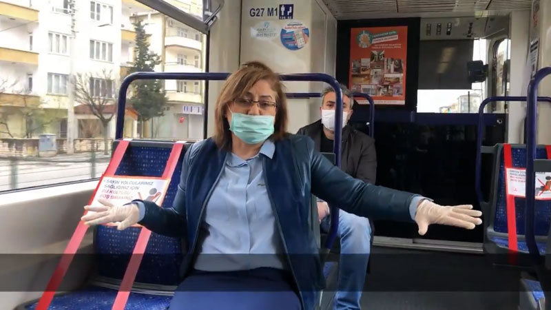 Sosyal mesafe kuralı gereği oturulmaması gereken koltuklara sert plastik bantlar konmuş. Başkan Şahin de bu kuralı anlatıp “Lütfen oturmak için zorlamayın” diyor.