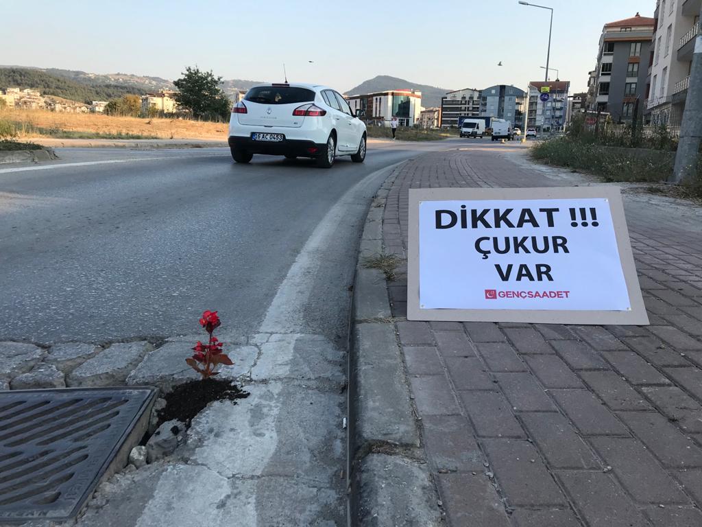 Saadet Partisi İl Gençlik Kolları Başkanı Enes Durmuş ve arkadaşlarının kent içindeki ana yollarda çukurların yanına “Dikkat Çukur Var” uyarısı koyarak yaptılar.