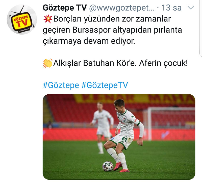 “Borçları yüzünden zor zamanlar geçiren Bursaspor altyapıdan pırlanta çıkarmaya devam ediyor. Alkışlar Batuhan Kör’e. Aferin çocuk.”