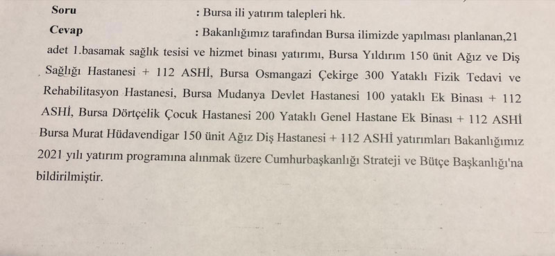 “Yıldırım’a yeni Ağız ve Diş Hastanesi planlandı. Osmangazi’ye de Murat Hüdavendigar Ağız ve Diş Hastanesi yapılacak. 150’şer üniteli hastanelerin yerleri kesinleşmedi.”