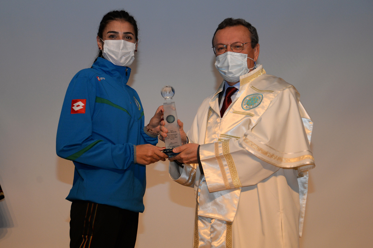 Tokyo Olimpiyatı’nda bronz madalya kazanan tekvandocu Hatice Kübra İlgün ile gümüş madalya kazanan karateci Eray Şamdan’a da özel ödül verilmiş.