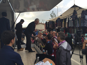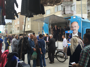 AK Parti İl Başkanlığı’nın seçim çalışmaları için hazırlattığı ve açıldığında platforma dönüşen kapalı kasa kamyonu seçim çalışması yapacağı pazaryerinin girişine çektiriyor.