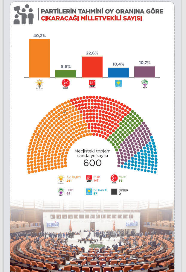 AK Parti’nin 261, CHP’nin 147, MHP’nin 56, HDP’nin 69, İYİ Parti’nin 67 milletvekili çıkarabileceği tahmin ediliyor.