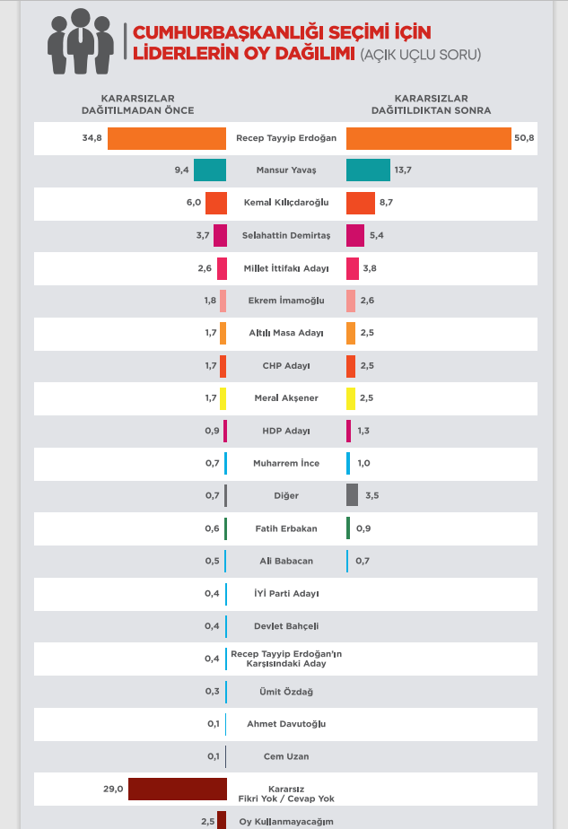 Recep Tayyip Erdoğan yüzde 50.8, Mansur Yavaş yüzde 13.7, Kemal Kılıçdaroğlu yüzde 8.7, Selahattin Demirtaş yüzde 5.4, Millet İttifakı Adayı yüzde 3.8, Ekrem İmamoğlu yüzde 2.6, Altılı Masa Adayı yüzde 2.5, CHP Adayı yüzde 2.5, Meral Akşener yüzde 2.5, HDP Adayı yüzde 1.3, Muharrem İnce yüzde 1, Fatih Erbakan yüzde 0.9, Ali Babacan yüzde 0.7, diğerleri yüzde 3.5.