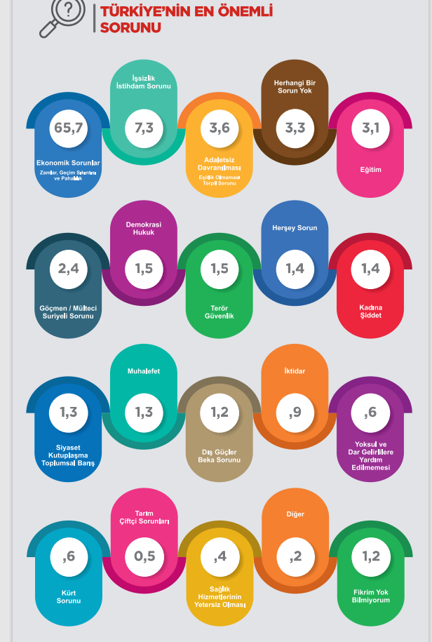 Çünkü, ekonomik sorunlar yüzde 65.7 çıkarken, ikinci sırada yüzde 7.3’le işsizlik, üçüncü sırada ise yüzde 3.6’yla adaletsiz davranılması yer alıyor. Listede göçmen-mülteci sorunu da yüzde 2.4’e gerilemiş.