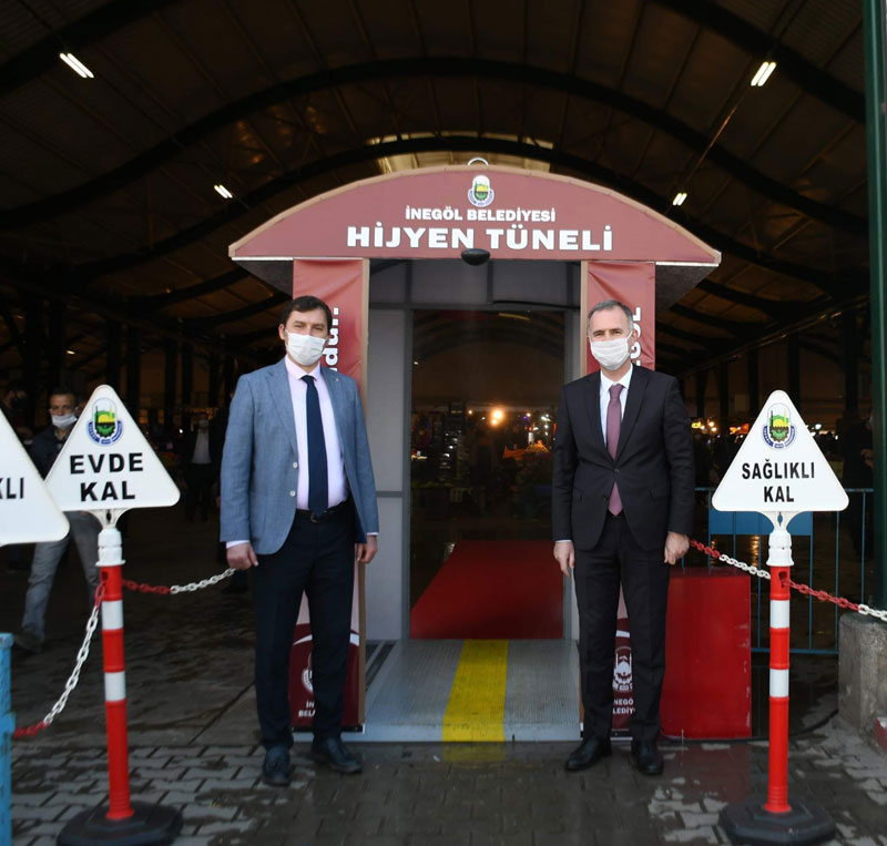 İnegöl Belediye Başkanı Alper Taban da, belediye Fen İşleri bünyesinde kendi olanaklarıyla ürettikleri Hijyen Tüneli’ni ilçede kurulan pazaryerlerinin girişine koyup, pazar alışverişini sağlık açısından güvenli hale getiriyor.
