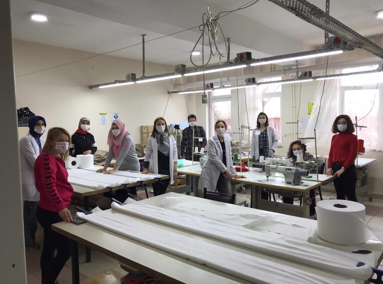 Firmalar maske üretimine yönelirken, geçen aya kadar moda tasarımı ve teknoloji eğitimi alan Bursa Zübeyde Hanım Mesleki ve Teknik Anadolu Lisesi öğretmen ve öğrencileri de okullarının tatil olmasına karşın atölyeye girip koruyucu maske üretiyorlar.
