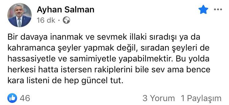 AK Parti İl Başkanı Ayhan Salman sakin ve siyasi ilişkilerinde kırmamaya yönelik dengeli yaklaşımıyla biliniyor. Sosyal medyayı da iyi kullanıyor ve düşüncelerini bu yolla duyuruyor.